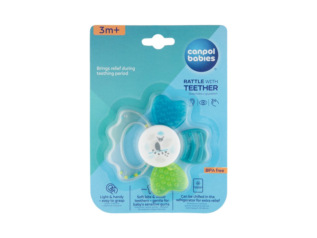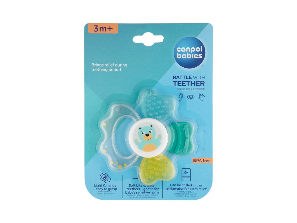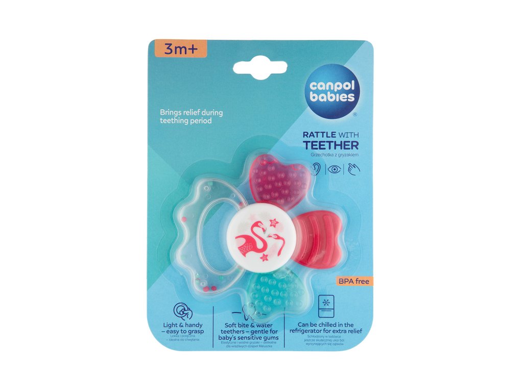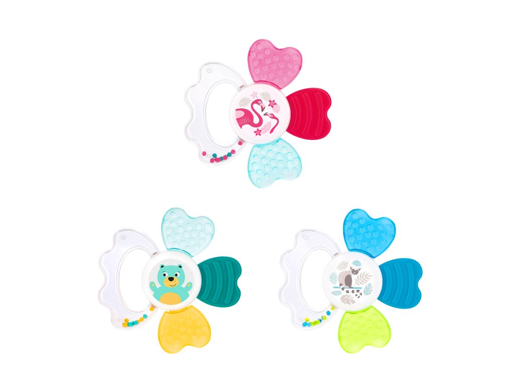 Chrastítko s kousátkem je určeno pro nejmladší děti. Kombinuje výhody pružného kousátka a chrastítka, protože obsahuje velké měkké části, které poskytují úlevu při růstu zoubků. Atraktivní tvary a intenzivní barvy přitahují pozornost dítěte. Měkké části jsou přizpůsobeny pro jemné dětské dásně. Chrastítka jsou vyrobena z odolných a bezpečných materiálů (bez ostrých hran). Před podáním dítěti můžete ochladit v ledničce. To pomůže uklidnit dásně dítěte.