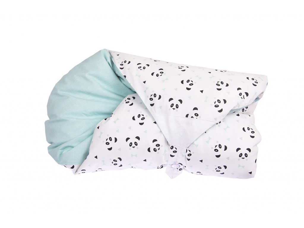 Originální povlak ve vzoru zoo panda tyrkys k péřové zavinovačce Dráček velikosti 80×80cm.