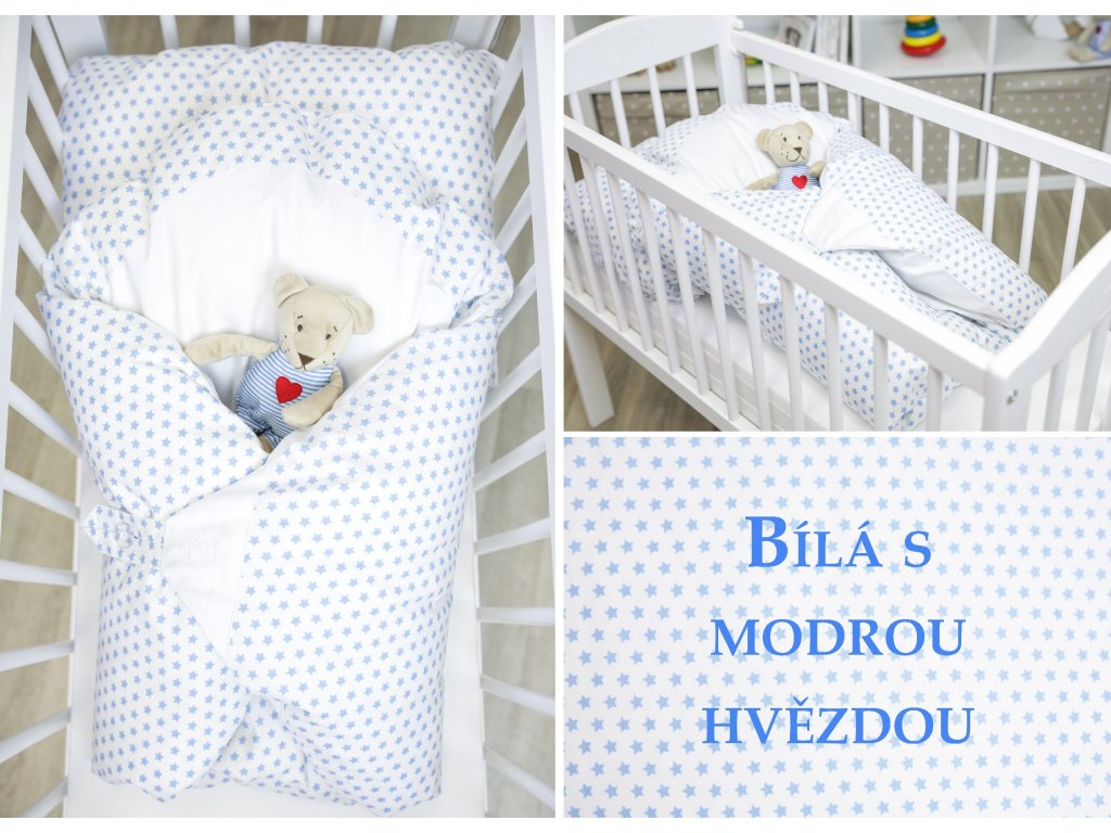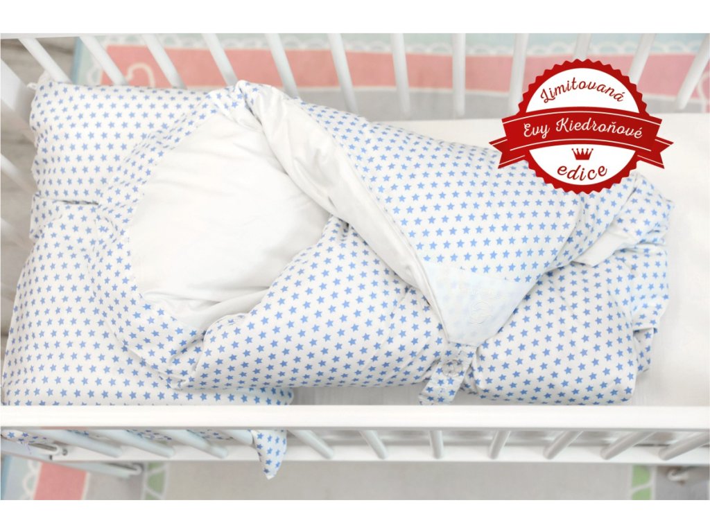 Set 4v1 Dráček - Bílý s modrými hvězdičkami s bílým polštářkem + Získáte webinář - Mít peřinku není všechno