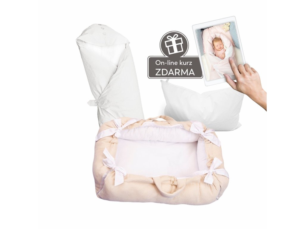 SET 5v1 - Malý Pelíšek - Bílý jednobarevný s kytičkami / Béžová wafle + Zdarma online kurz - Hnízdění miminka v pelíšku