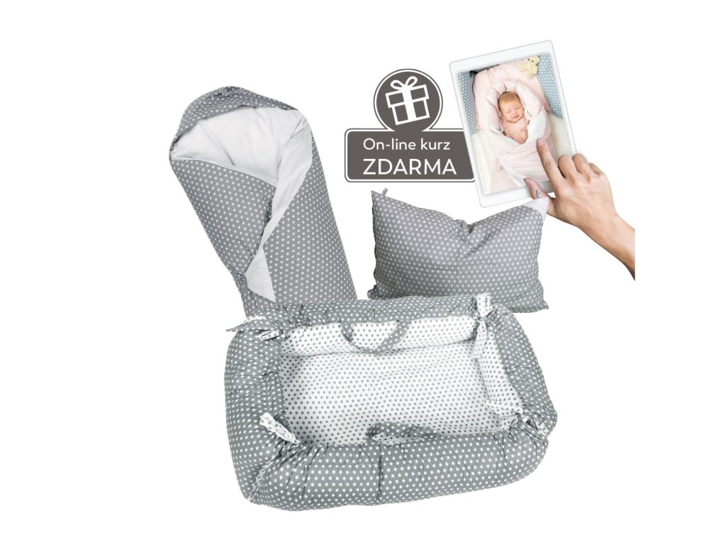 SET 5v1 - Malý Pelíšek - Šedý s bílými hvězdičkami + Zdarma online kurz - Hnízdění miminka v pelíšku