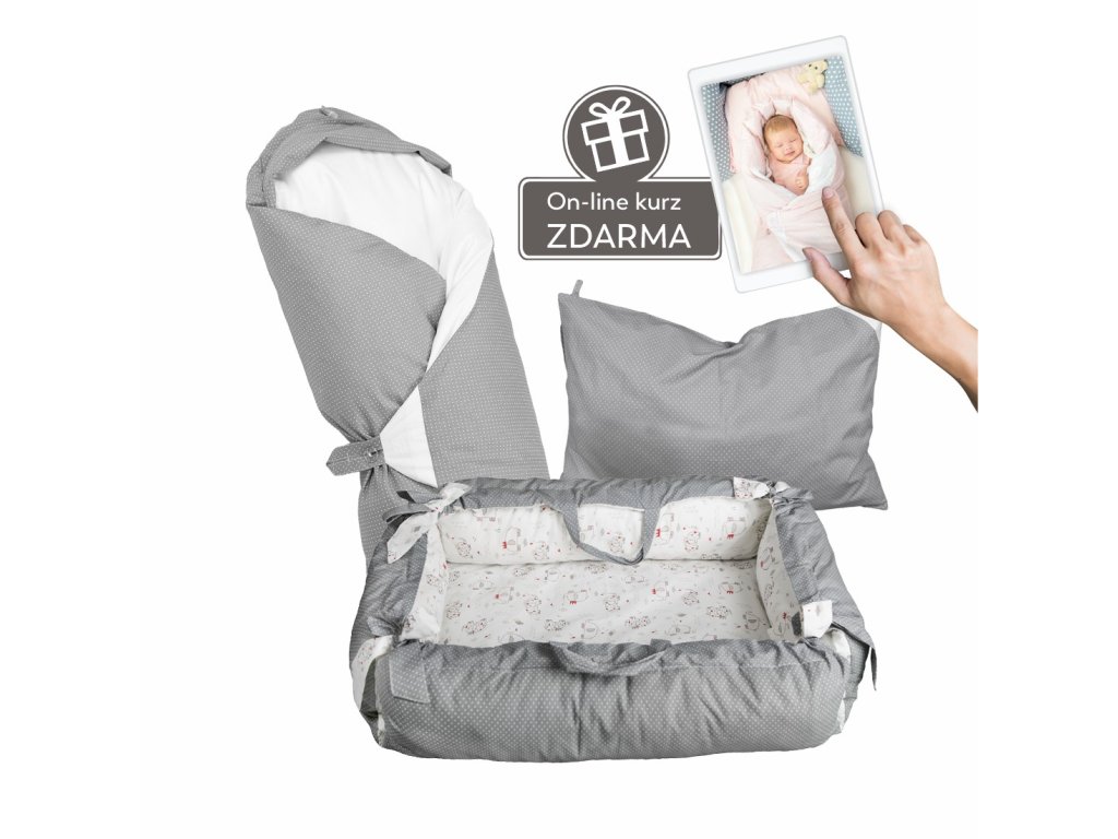SET 5v1 - Malý Pelíšek - Šedý s bílými tečkami + Zdarma online kurz - Hnízdění miminka v pelíšku